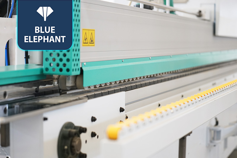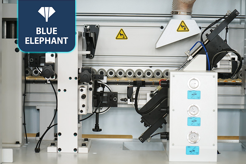 該設(shè)備采用45°斜邊鋸,使直板進(jìn)入板材進(jìn)行切割銑型成45°斜邊,通過斜直膠鍋和斜直一體壓貼,使封邊帶與斜直邊板材粘合更緊密。